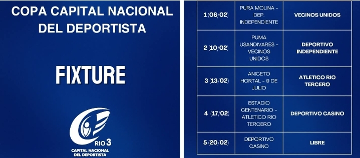 El torneo Copa Capital Nacional del Deportista dará inicio el próximo 6 de febrero en la cancha de Independiente de Río Tercero. Según informó Pipo Acotto, parte de la organización, la competencia contará con la participación de varios clubes locales y será coordinada por la Dirección de Deportes y la municipalidad.