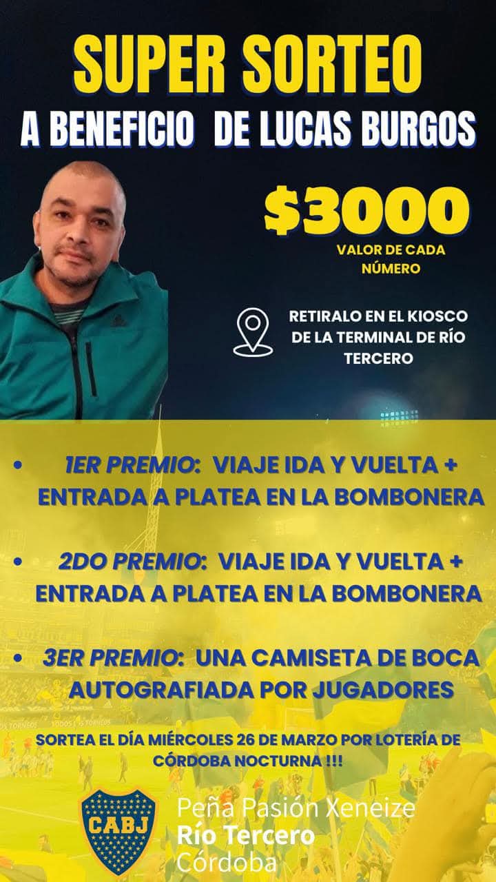 La Peña Oficial de Boca Río Tercero ha lanzado una rifa solidaria para recaudar fondos destinados a ayudar a Lucas Burgos, un hombre muy querido en la comunidad, quien recientemente sufrió un accidente que lo dejó con un grave problema en su ojo, afectando su capacidad para trabajar y ser el sostén de su familia.
