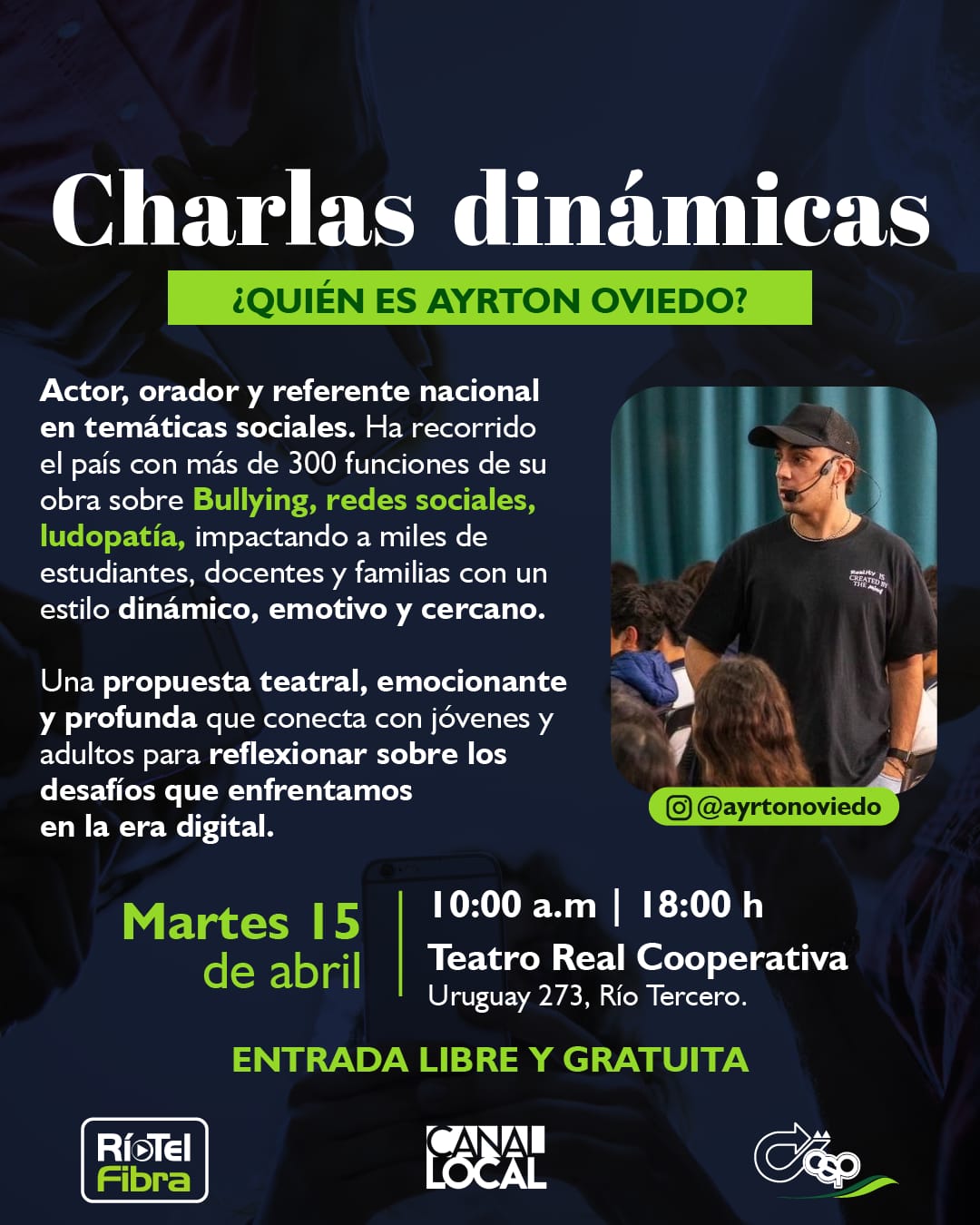 Ayrton Oviedo se destaca por su capacidad de conectar con los jóvenes a través del humor, la actuación y la reflexión, lo que hace de esta charla un evento interactivo y enriquecedor para toda la comunidad.