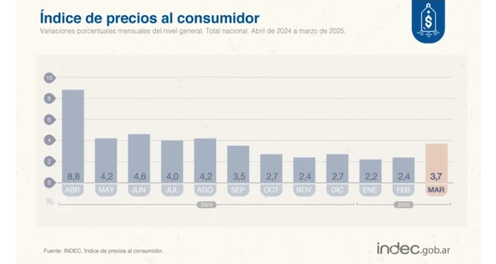 Según el reporte del Indec de este viernes, el nivel general del Ãndice de precios al consumidor registró un alza mensual de 3,7% en marzo de 2025 y acumuló en el año una variación de 8,6%, lo que en los cálculos de la comparación interanual reportó un incremento de 55,9%.