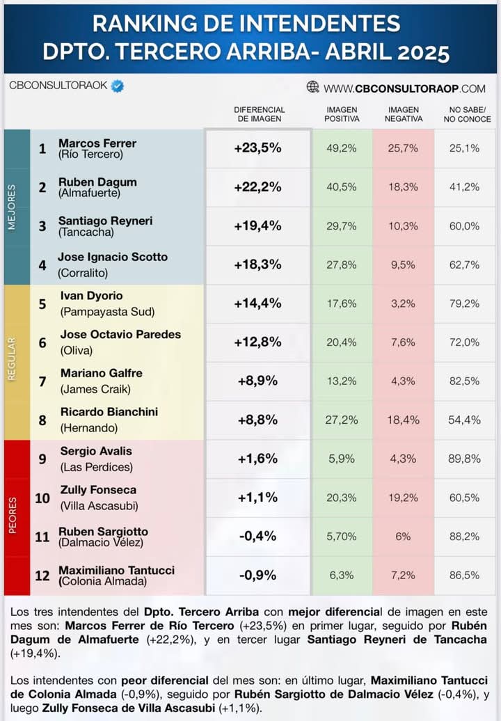 Intendentes con mayor imagen positiva: Marcos Ferrer (Río Tercero) lidera el ranking con un 49,2%. Rubén Dagum (Almafuerte) le sigue con el 40,5%. Santiago Reyneri (Tancacha) alcanza un 29,7%. José Ignacio Scotto (Corralito) tiene un 27,8%. Ricardo Bianchini (Hernando) obtiene un 27,2%. José Octavio Paredes (Oliva) cuenta con un 20,4%. Zully Fonseca (Villa Ascasubi) registra un 20,3%. Intendentes con menor imagen positiva: Sergio Avalis (Las Perdices): 5,9% Rubén Sargiotto (Dalmacio Vélez): 5,7% Maximiliano Tantucci (Colonia Almada): 6,3% Imagen negativa más alta: Zully Fonseca: 19,2% Ricardo Bianchini: 18,4% Rubén Dagum: 18,3% Menor imagen negativa: Iván Dyorio (Pampayasta Sud): 3,2% Mariano Galfre (James Craik): 4,3% Sergio Avalis (Las Perdices): 4,3% Estos datos muestran un panorama diverso en cuanto a la percepción ciudadana hacia los intendentes de la región, destacando el fuerte respaldo que mantiene Ferrer en Río Tercero.