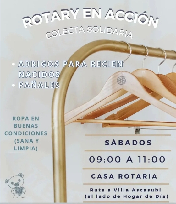 El Rotary Club Río Tercero, a través de su área de salud materno infantil y con el apoyo de las damas rotarias, organiza una colecta solidaria de ajuares destinada a mamás que dan a luz en el hospital local y no cuentan con elementos básicos para sus bebés. La campaña se llevará a cabo todos los sábados de mayo, de 9 a 11 h, en la sede del club. También se ofrece la posibilidad de retirar las donaciones a domicilio. Se solicita ropa de bebé en buen estado, mantas, lanas y artículos tejidos. Más información al 3571-32 1956.