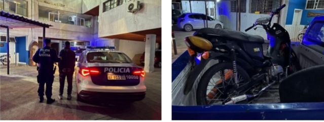 Barrio Acuña – Alrededor de las 03:00 horas, personal policial procedió a la aprehensión de un joven de 22 años y una joven de 19, quienes circulaban en una motocicleta marca Corven de 110 c.c. sin dominio colocado, sin espejos retrovisores y sin casco protector.
