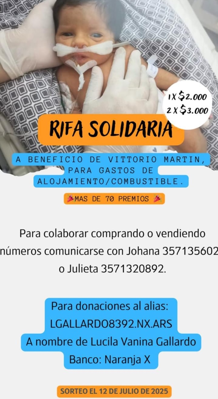 Vittorio nació antes de tiempo, con apenas 36 semanas de gestación y una complicación en el embarazo: una fisura en la bolsa amniótica. Esa condición le provocó falta de oxígeno al nacer, y debió ser internado de urgencia en la ciudad de Alta Gracia, donde aún permanece bajo cuidados médicos. Su mamá hace todo lo posible por estar a su lado, viajando constantemente para acompañarlo, pero la situación económica no es fácil. Combustible, alojamiento, comida y traslados son costos diarios que la familia no puede sostener sola.