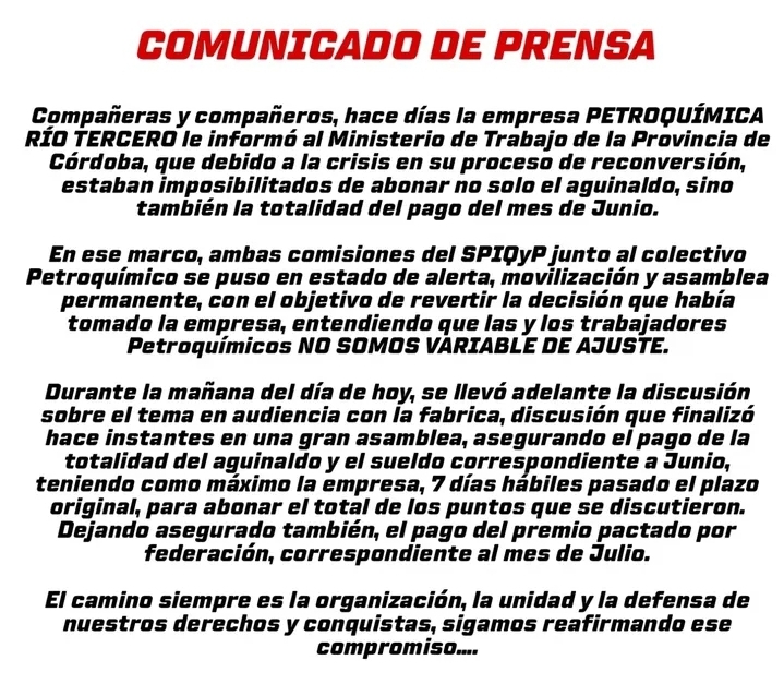 El Sindicato del Personal de Industrias Químicas y Petroquímicas de Río Tercero (SPIQyP) emitió un comunicado en el que informó que la empresa Petroquímica Río Tercero había manifestado al Ministerio de Trabajo de Córdoba su imposibilidad de afrontar el pago del aguinaldo y del salario de junio, debido a la crisis en su proceso de reconversión.