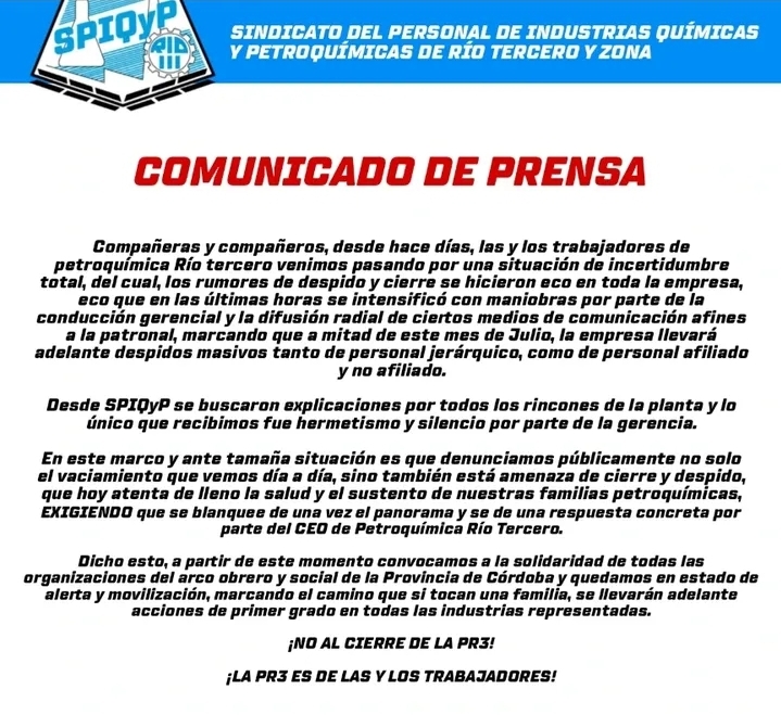 El Sindicato del Personal de Industrias Químicas y Petroquímicas de Río Tercero (SPIQyP) emitió un duro comunicado en el que advierte sobre una situación de incertidumbre total que atraviesan las y los trabajadores de Petroquímica Río Tercero, ante crecientes rumores de despidos masivos y un posible cierre de la planta.