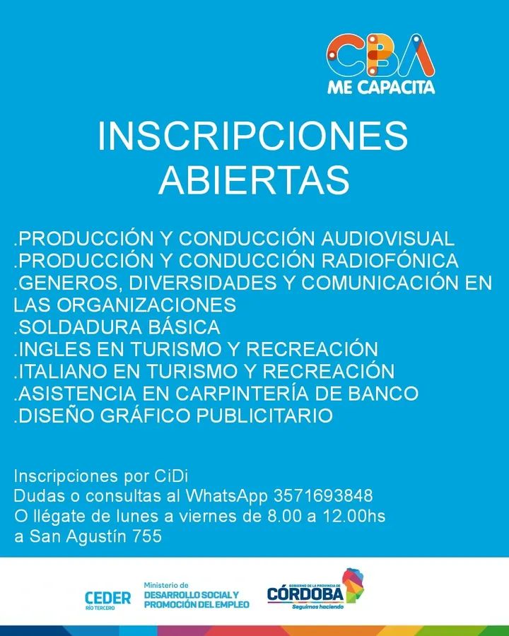 Leticia Rubio, integrante del Centro de Desarrollo Regional (CEDER) Río Tercero, informó sobre la apertura de inscripciones para los nuevos cursos de capacitación gratuitos que se dictarán en la segunda mitad del año. Entre las propuestas se encuentran: producción y conducción audiovisual (radio), géneros, diversidades y comunicación en organizaciones, soldadura básica, inglés e italiano para turismo, asistencia en carpintería de banco y diseño gráfico publicitario.
