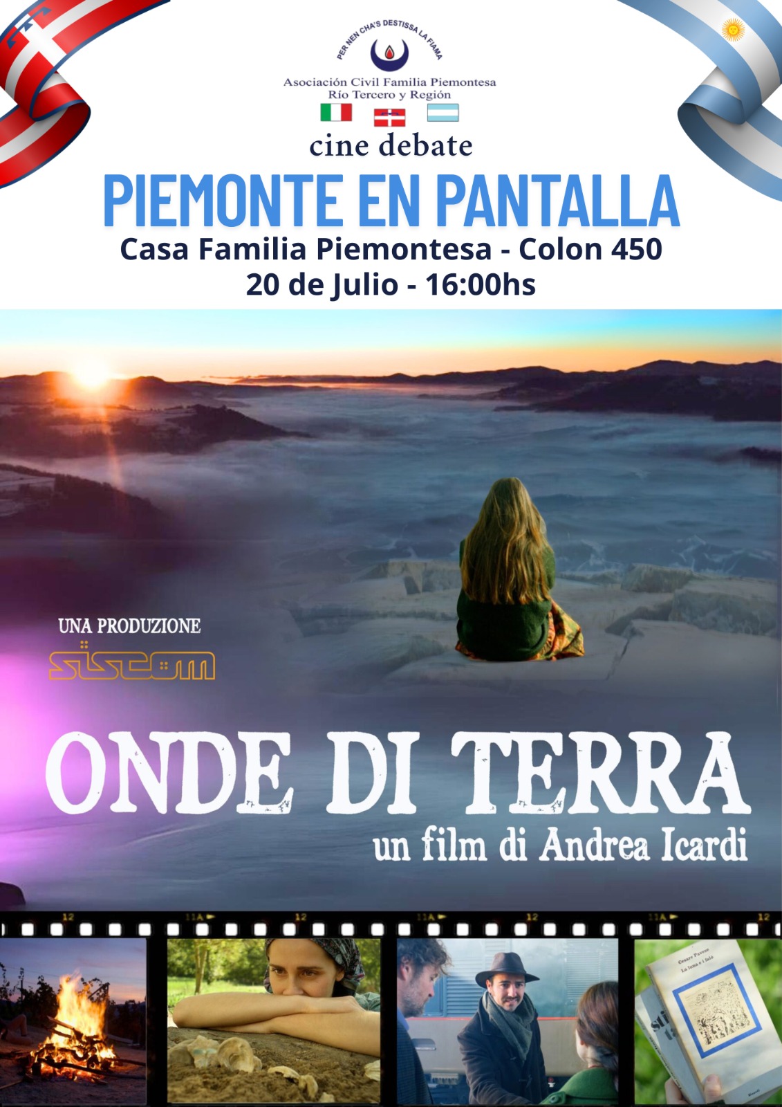 Este sábado 20 de julio a las 16:00 hs, la Asociación Civil Familia Piemontesa de Río Tercero y Región invita a disfrutar de una tarde especial en su sede de Colón 450. En el marco del Día del Amigo, se proyectará de forma gratuita el film “Onde di Terra”, del director Andrea Icardi, una emotiva historia que retrata la vida de los inmigrantes italianos en la posguerra.