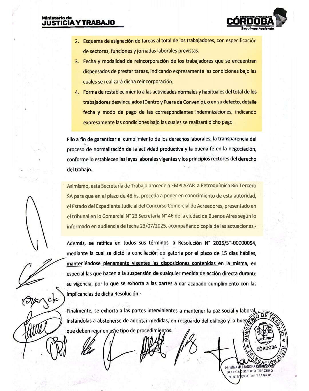 Entre los puntos requeridos por la Secretaría se incluyen: 1. Cronograma detallado de puesta en funcionamiento de la planta, con fechas estimativas y etapas de reactivación. 2. Esquema de asignación de tareas al total de los trabajadores, indicando sectores, funciones y jornadas. 3. Fecha y modalidad de reincorporación de los trabajadores dispensados de tareas, incluyendo condiciones laborales. 4. Detalle sobre la restitución de actividades normales o, en su defecto, condiciones de pago de indemnizaciones para trabajadores desvinculados. Además, la Secretaría emplazó a la empresa a que en el mismo plazo de 48 horas informe el estado del expediente del concurso preventivo de acreedores, presentado en el Juzgado Comercial N.º 23 Secretaría N.º 46 de la ciudad de Buenos Aires, conforme lo declarado en audiencia el pasado 23 de julio. Asimismo, se ratificó la plena vigencia de la Resolución N.º 2025/ST-00000054, que dictó la conciliación obligatoria y suspendió cualquier medida de acción directa durante su curso. Finalmente, se exhortó a todas las partes intervinientes a mantener la paz social y laboral, instándolas a evitar medidas que interfieran con el diálogo y la negociación institucional.