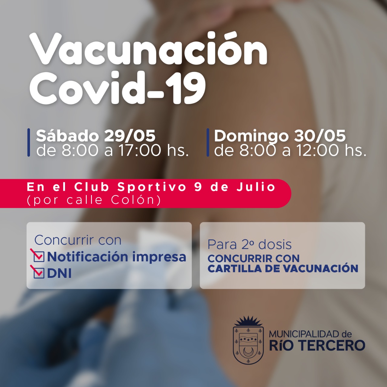 Se informa que esté Sábado de 8:00 a 17:00hs. y el Domingo de 8:00 a 12:00hs. se procederá a vacunar a las personas que hayan sido notificadas. Deberán concurrir al Club Sportivo 9 de Julio con su DNI y la notificación impresa.