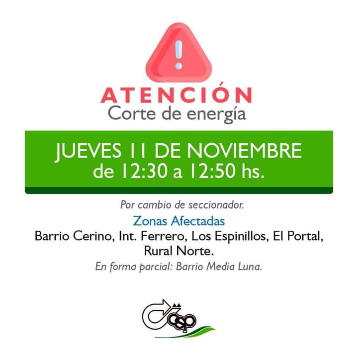Entre las 12 30 y las 12 50 aproximadamente habrá un corte de energía que afectará a los barrios Cerino, intendente Ferrero, Los Espinillos, El Portal y parte de Media Luna. Se debe a que la cooperativa de Obras y Servicios Públicos realizará trabajos de recambio se un seccionador fusible en barrio Cerino, a los fines de evitar problemas futuros. Así lo explicó el gerente de la Cooperativa, Roberto Aliciardi, quien sostuvo que el inconveniente fue detectado en el marco del plan de mantenimiento de la entidad.