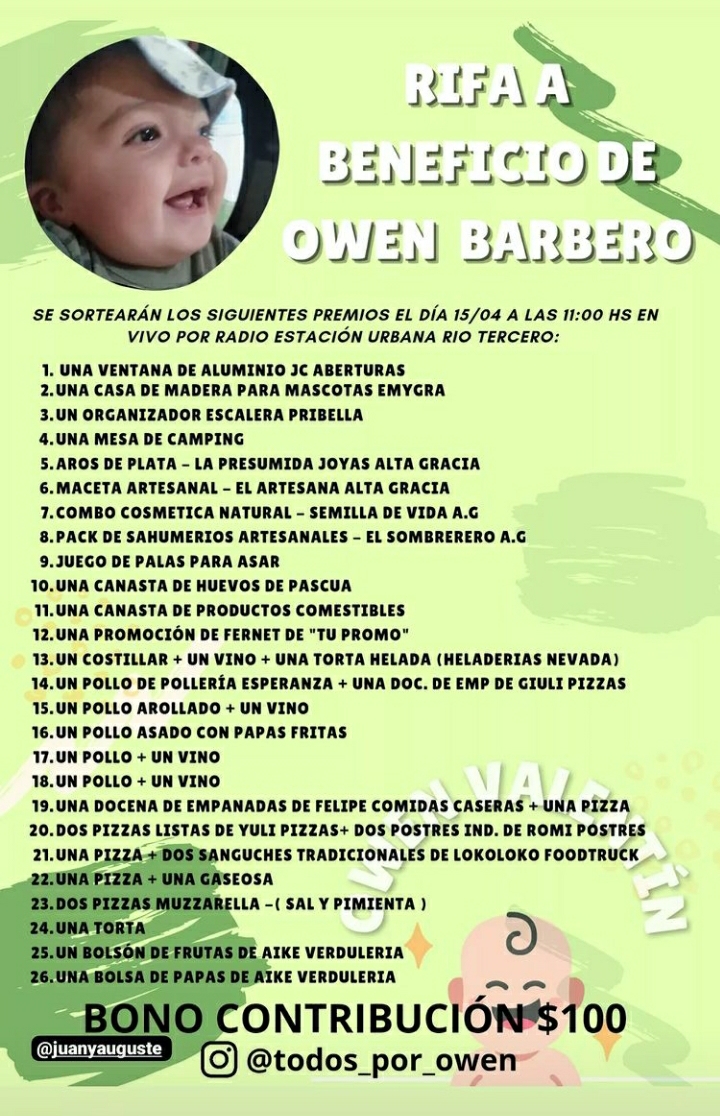 El pequeño Owen debe realizarse una importante cantidad de estudios y probablemente le deban realizar un implante en su oído derecho. Estuvimos en comunicación con con papá, Joel Barbero, quien comentó que están vendiendo números para una rifa que se sorteará el 15 de abril en nuestra emisora. El número tiene tiene costo de 100 pesos y pueden solicitarlo por WhatsApp al 3571 570260, o a través de las redes sociales de Joel Barbero o Juany Auguste.