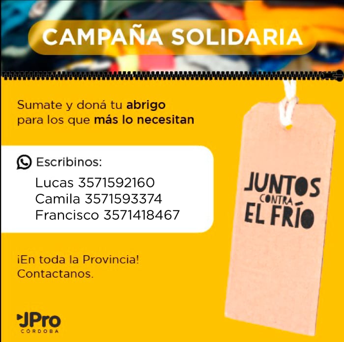 En comunicación con Mañanas Compartidas Lucas Grinovero manifestó que la campaña se realiza a nivel provincial por tercer año consecutivo, para ayudar a los sectores más vulnerables a soportar la época más difícil del año. Se puede donar ropa de abrigo y frazadas en buen estado. Para ello se pueden comunicar con los números 3571 593374 (Camila), 3571 418467 (Francisco) ó 3571 592160 (Lucas).