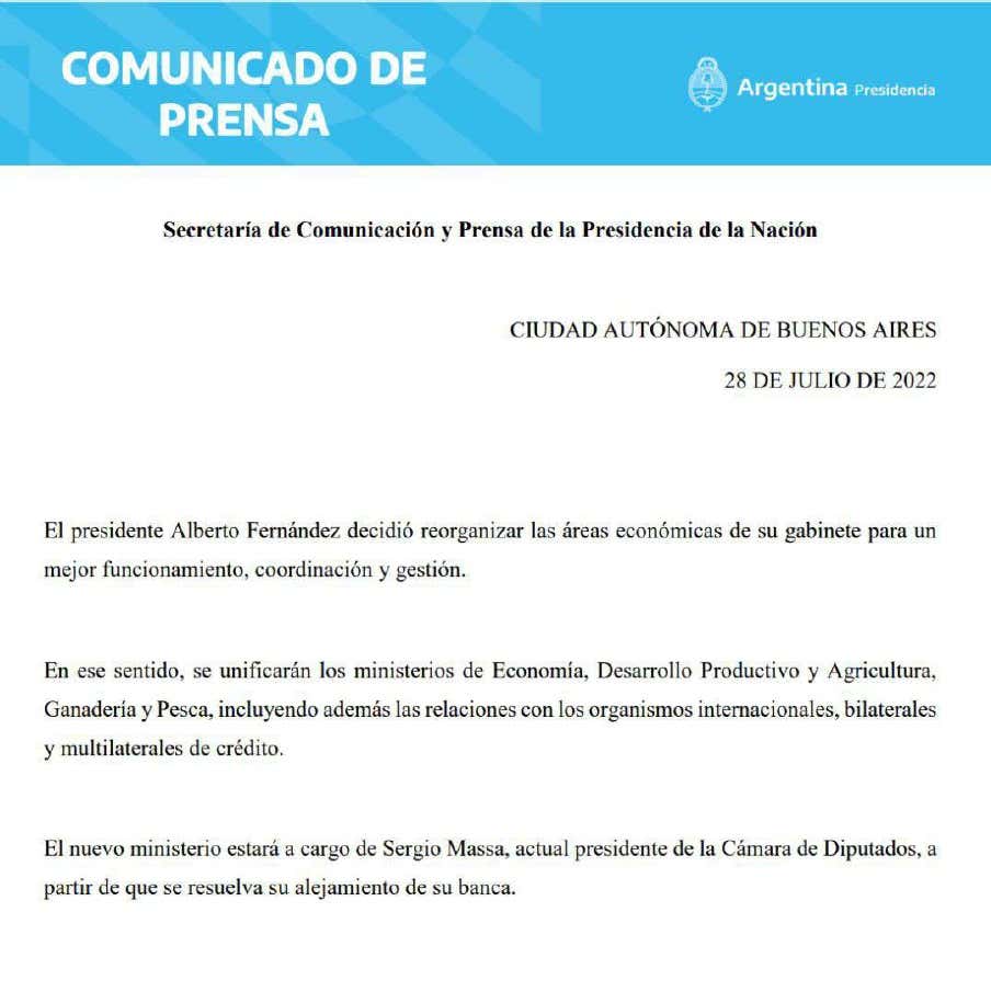 El presidente Alberto Fernández decidió este jueves reorganizar las áreas económicas de su gabinete y designó al presidente de la Cámara de Diputados, Sergio Massa, al frente de un Ministerio unificado de Economía, Desarrollo Productivo y Agricultura, Ganadería y Pesca, y que tendrá también a su cargo las relaciones con los organismos internacionales, bilaterales y multilaterales de crédito.