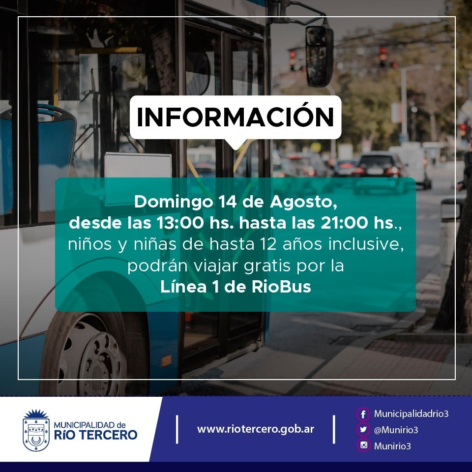 ?‘? Este domingo 14 de Agosto ?“…, desde las 13:00 hs. ? hasta las 21:00 hs. ?, niños y niñas de hasta 12 años inclusive?“?, podrán viajar gratis por la Línea 1 del servicio de transporte público Río-Bus, para disfrutar del Día de las Infancias.