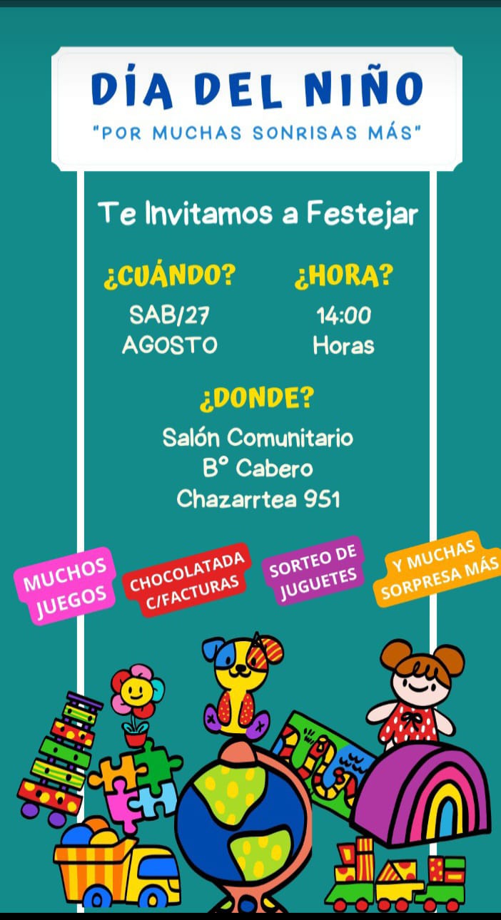 Bajo el lema "Por muchas sonrisas más", la comisión vecinal de barrio Cabero celebrará este sábado a partir de las 14 el Día del Niño. Al respecto dialogamos con el presidente de la comisión vecinal, Jorge Martínez, quien señaló que el festejo se realizará en la plaza si el tiempo lo permite y si no se concretará en el salón comunitario.